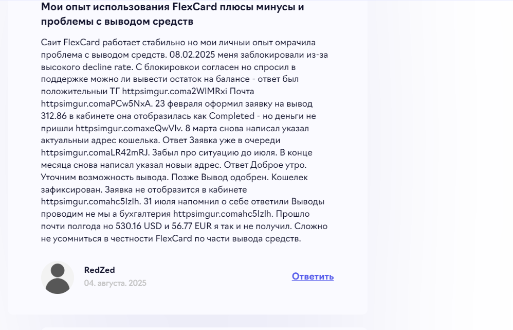 Пользователям блокируют счета и денег не возвращают. Есть много жалоб про отсутствие ответа от техподдержки сервиса. Интересно, что про отличную работу FlexCard карты отзывы довольных пользователей были в 2024 году. В 2025 участились жалобы на блокировки, требования поручительства и рекомендаций.