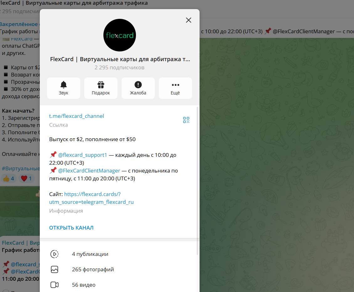 Поддержка сервиса работает в официальном канале сервиса ТГ FlexCardClientManager, отвечает на запросы клиентов с понедельника по пятницу, с 11:00 до 20:00 UTC+3. Техническая поддержка flexcard support1 доступна ежедневно с 10:00 до 22:00 UTC+3. Заметим, что интересы пользователей из РФ по времени работы поддержки, обслуживания клиентов не учтены.