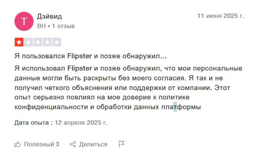 Однако пользователи Trustpilot в отзывах «Флипстер» высказывают серьёзные претензии. Это жалобы на утечку персональных данных, сложности с верификацией, плохой пользовательский опыт и отсутствие поддержки .