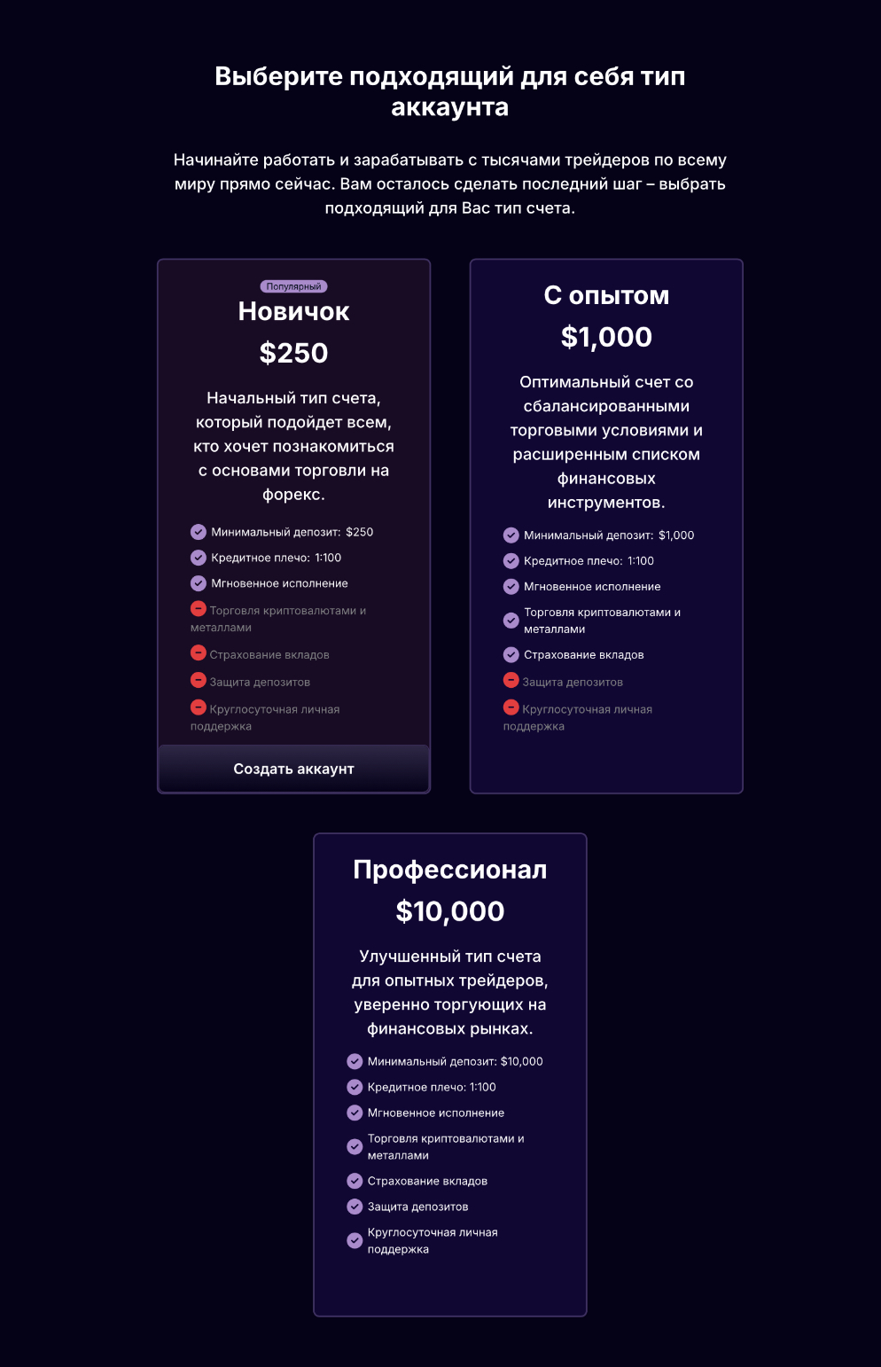 - «Профессионал». Минимальный депозит – 10 000 $. Доступны функции предыдущих уровней, а также круглосуточная личная поддержка и защита депозитов.