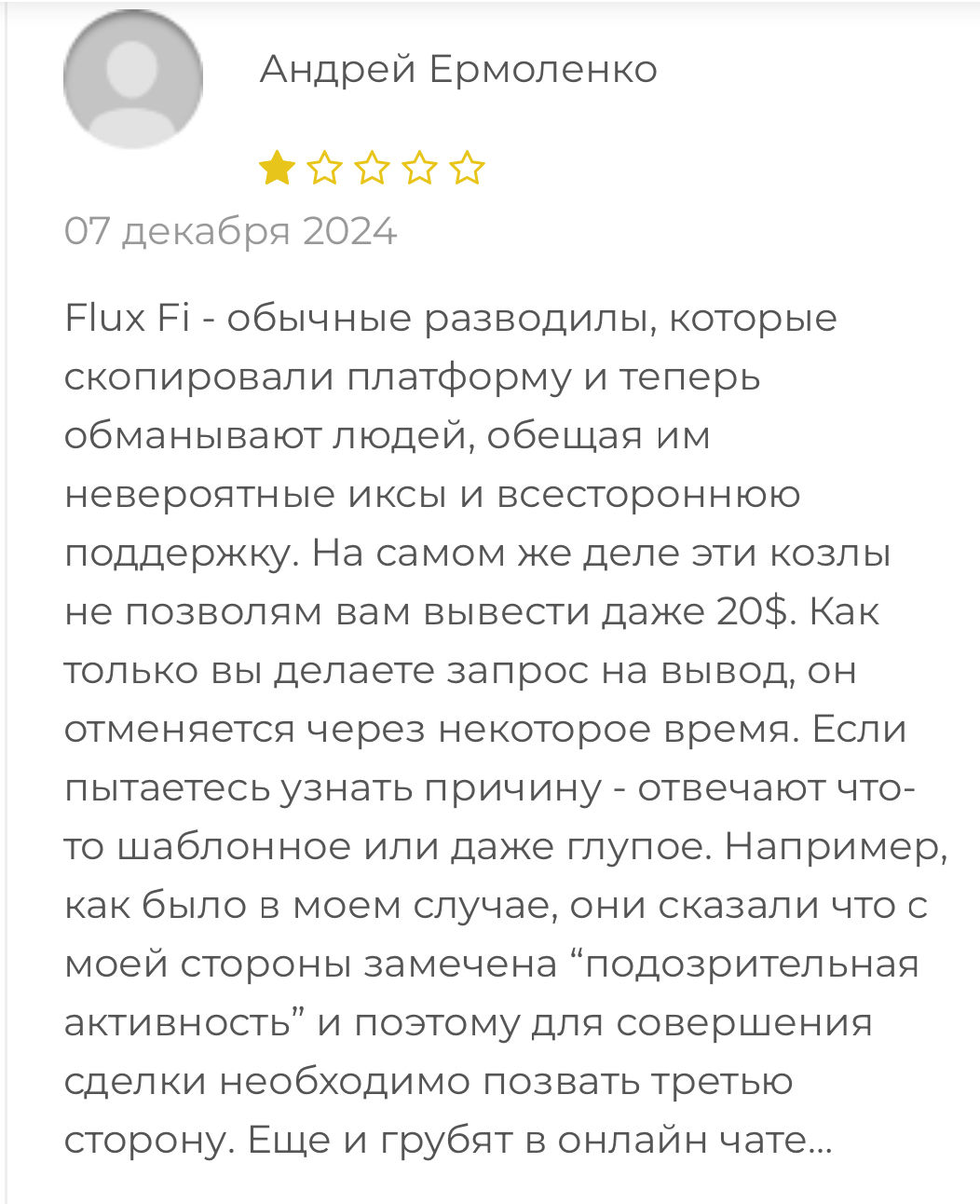 - Негативные оценки. Отзыв о Flux fi один, оценка отрицательная. Трейдер жалуется на невозможность вывода денег, а также грубую и бесполезную техподдержку.