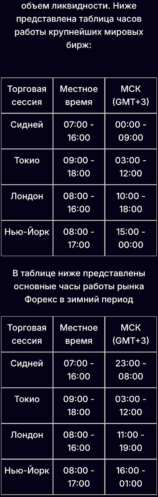 На сайте указана таблица с графиком работы мировых бирж и рынка Форекс.