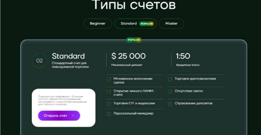 • тариф Standart предусмотрен для тех, кто уже получал прибыль от трейдинга и готов потерять в качестве депозита 25000$, но за это трейдер получит еще отсутствие свопа, сможет торговать на рынке криптовалют, открыть собственный ПАММ-счет, то есть получать деньги от инвесторов и торговать ими;