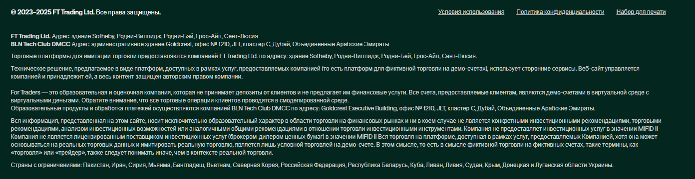FT Trading Ltd. зарегистрирована на Сент-Люсии, а компания ‍BLN Tech Club DMCC, занимающаяся платежами систем ForTraders – в Дубае, ОАЭ.