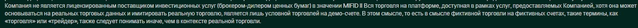 Компания прямым текстом указывает, что она нелицензированная и не предоставляет финансовых услуг в рамках регулируемых юрисдикций по типу ЕС или СНГ.