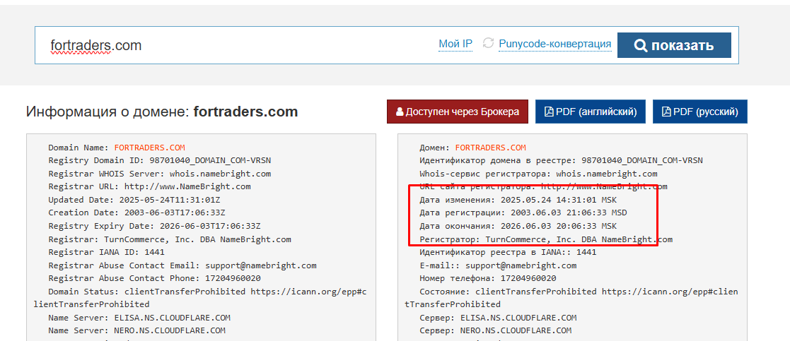Для начала, мы проверили домен For Traders com через известный сервис WhoIs. Оказывается, сайт работает давно – с июня 2003 года.