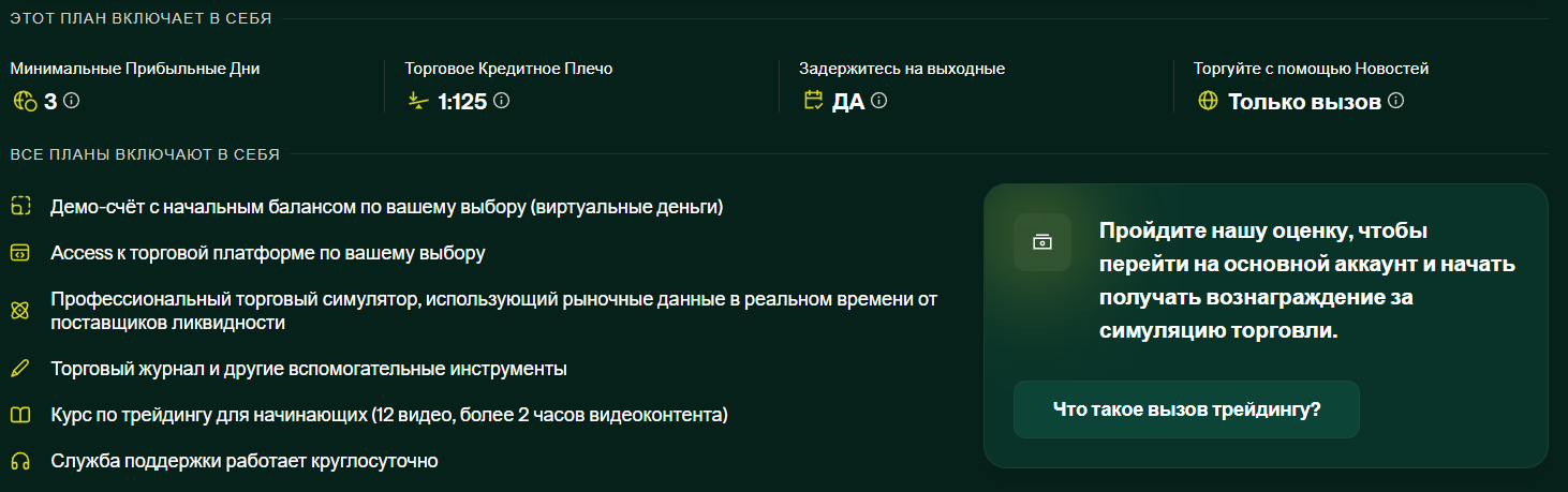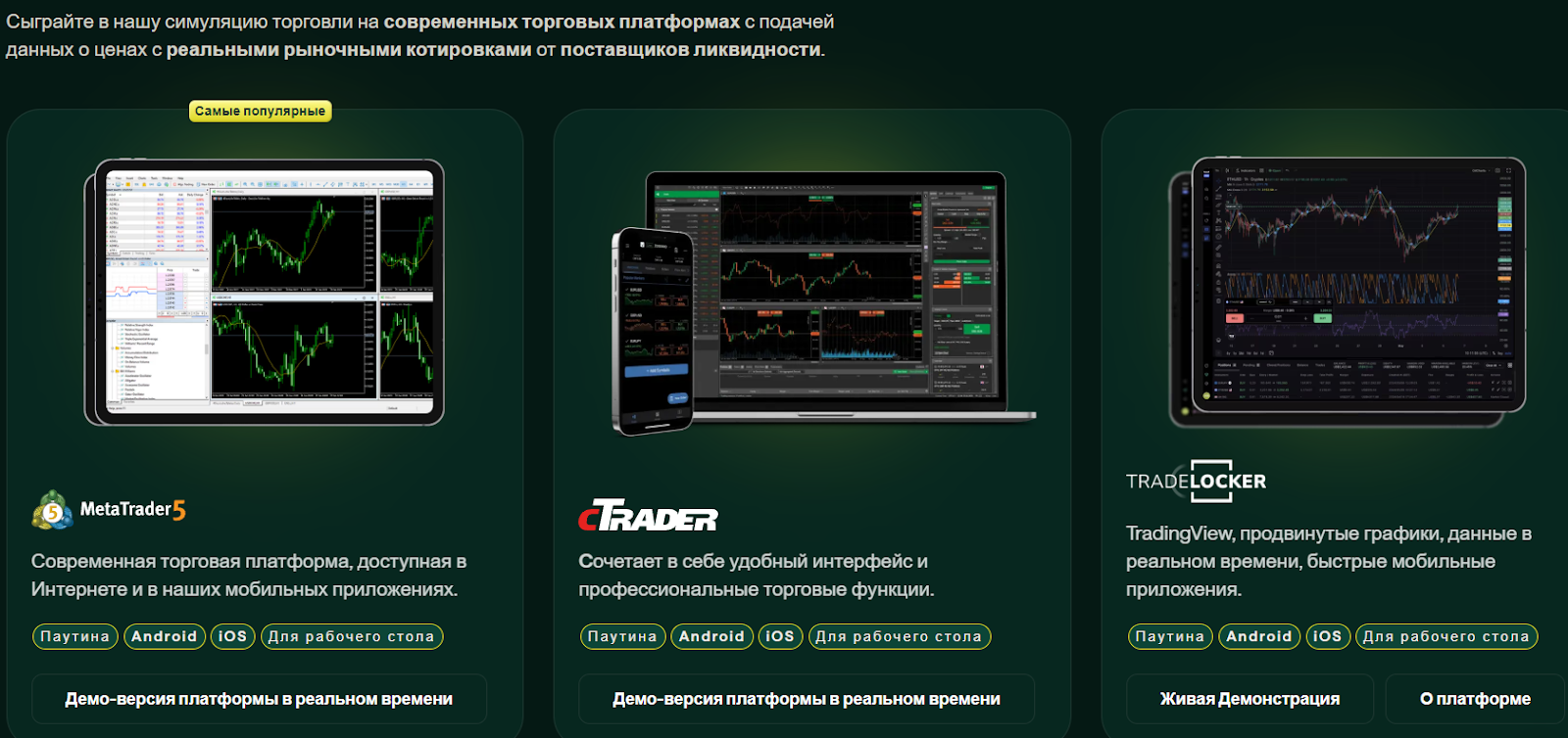 Сайт также отписывается насчет демо-счёта, тут предлагают три самых популярных торговых терминала: MT5, cTrader и TradeLocker, известные своим многофункциональным интерфейсом и практичностью.