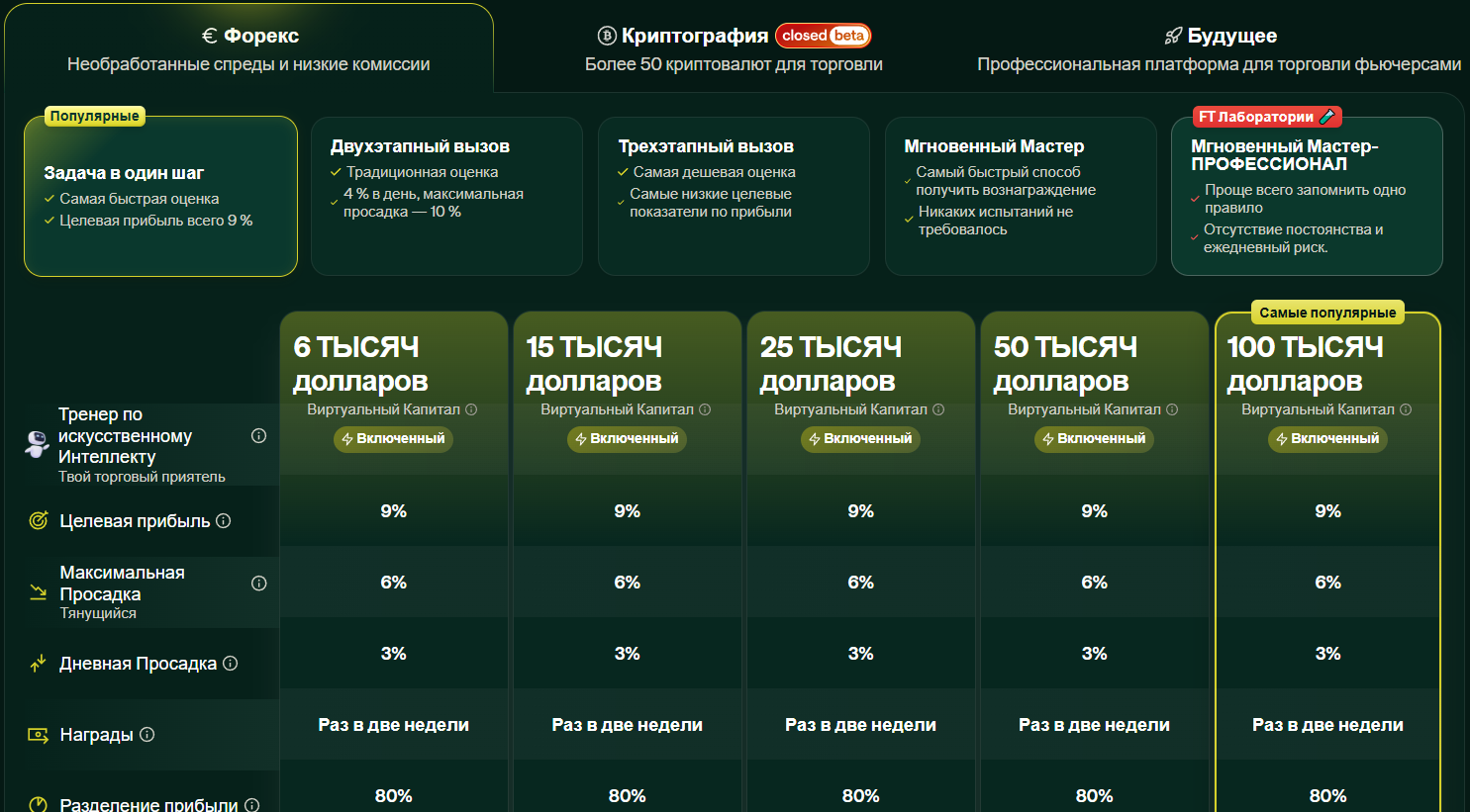 Самые низкие вложения – фьючерсы, всего $9.99/мес., а самые высокие депозиты относятся к Forex, где самый минимальный – $50, а максимальный депозит – $450. Все колонки имеют свои бонусы и дополнения, прописанные под ними.