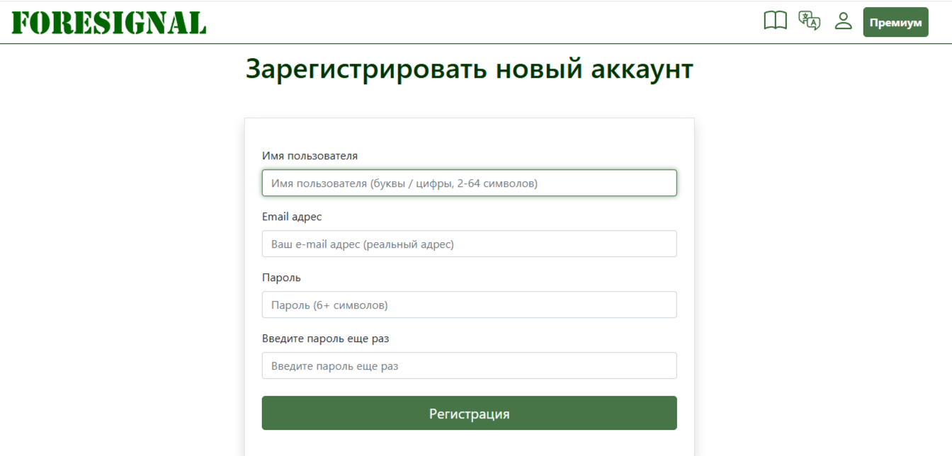 Для сотрудничества с Foresignal требуется создание аккаунта. Чтобы пройти регистрацию на сайте, достаточно заполнить стандартную форму.