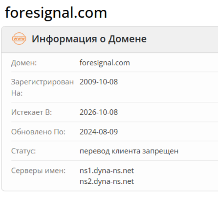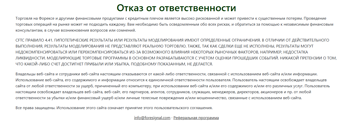 Официальный сайт foresignal com не содержит данных о компании, с которой сотрудничают трейдеры, лицензии, регистрации организации. Портал не раскрывает целевой аудитории какой юрисдикцией регулируется деятельность брокера, что говорит о высоких рисках для денег и конфиденциальной информации клиентов.