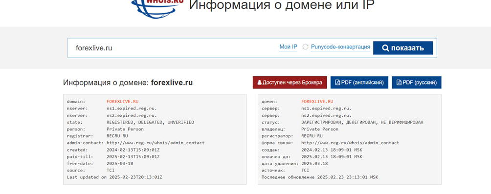 Второй тревожный момент – домен Forexlive зарегистрирован совершенно недавно (в 2024 году) и срок его действия уже истек. Неизвестно, будут ли организаторы проекта и дальше работать через этот доменный адрес или продолжат свою деятельность на другом дешевом сайте с подобным наполнением.