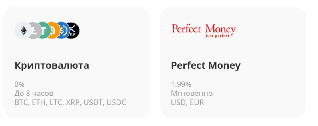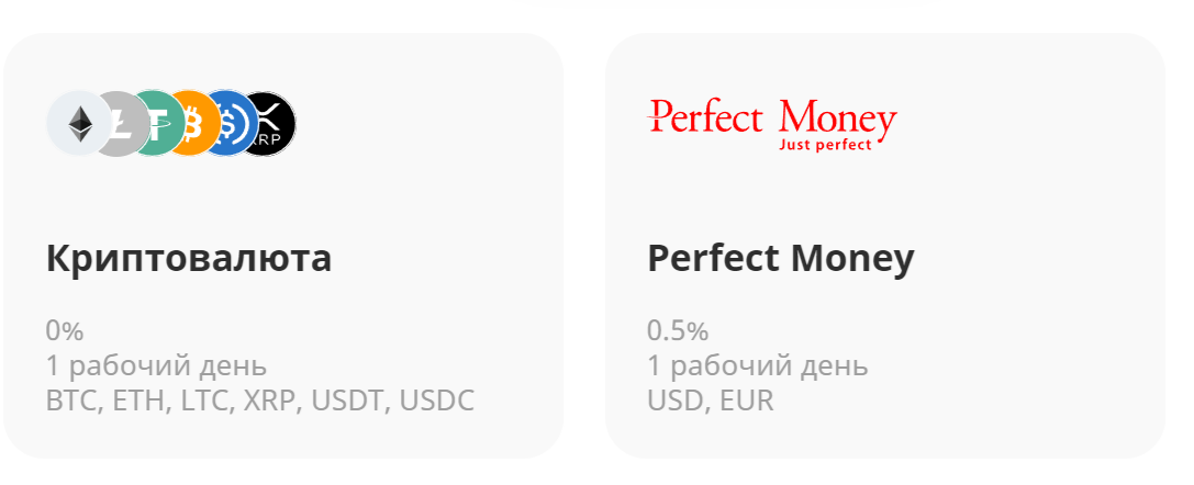 При выводе можно использовать те же варианты. При этом комиссия для крипты составляет 0%, а время выплат — до 24 часов. Для Perfect Money комиссионный платеж равен 0.5%, а время зачисления — сутки.