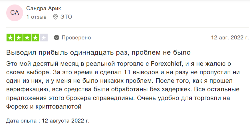 Чтобы понять, является ли брокер лохотроном, важно почитать отзывы о forexchief. И здесь ситуация явно не в пользу посредника. К примеру, на проекте Trustpilot он имеет рейтинг всего 3.2. При этом многие пользователи жалуются, что брокерская компания является мошенником. Жалобы касаются медленного зачисления денег на счет, обслуживания клиентов и ограниченного количества вариантов вывода средств.