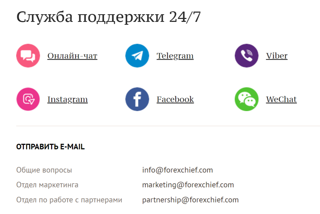 При желании оставить комментарий или задать вопрос специалистам можно обратиться в службу поддержки. Для этого доступна форма обратной связи, онлайн чат и электронная почта info@forexchief.com. Кроме того, представители компании ведут множество социальных сетей.
