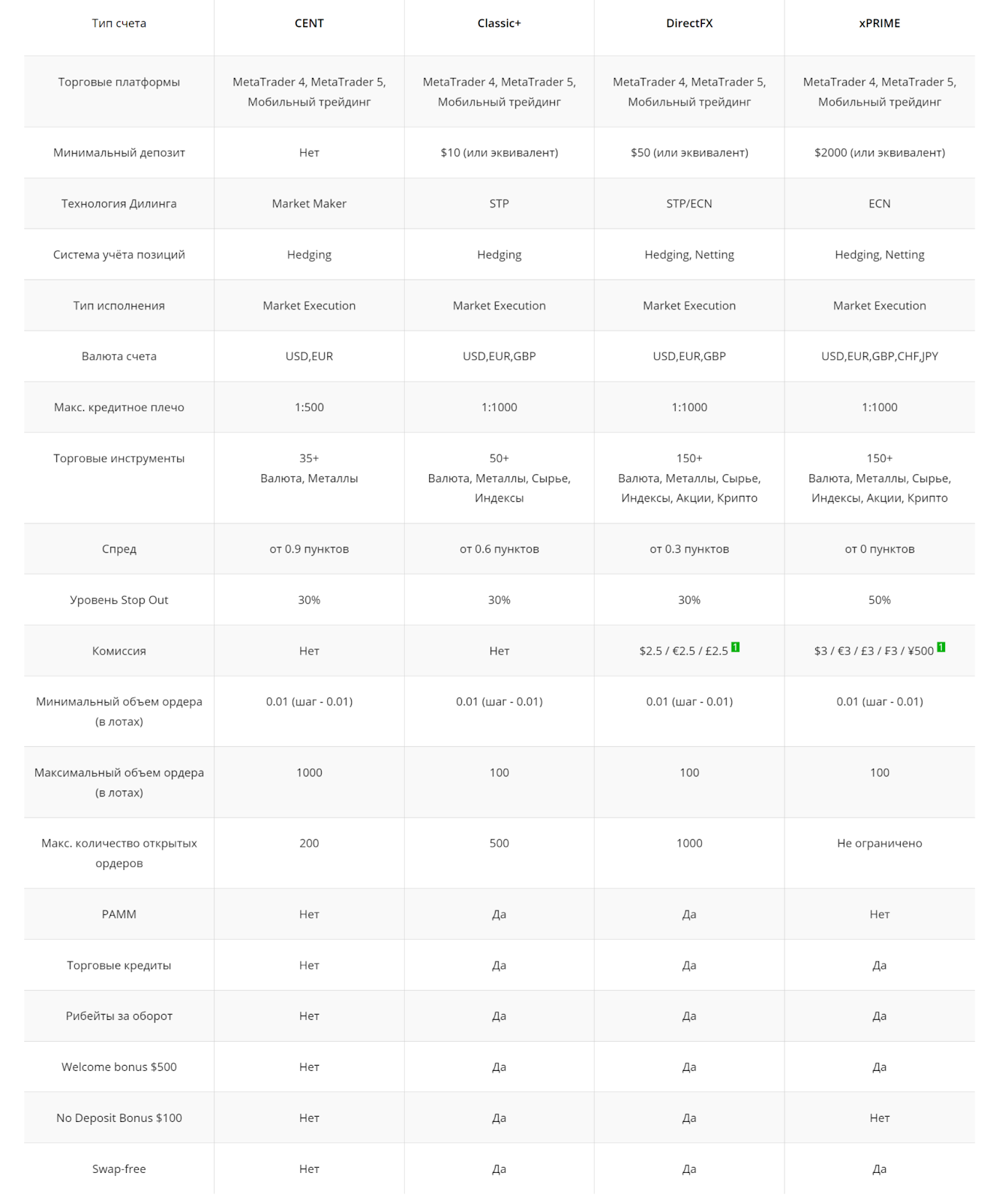 Особенностью брокера является большой выбор счетов, что свидетельствует об ориентации на трейдеров с разными финансовыми возможностями. В частности, новичкам доступен центовый тарифный план. Брокер приписывает ему следующие особенности: