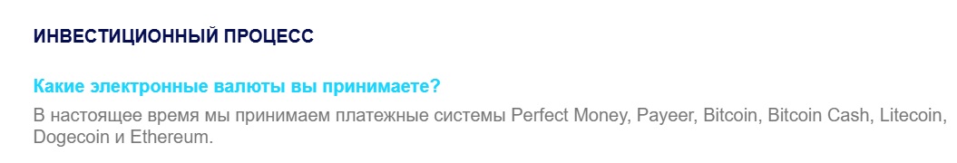 Брокер сообщает, что для вывода средств и внесения денег на баланс можно воспользоваться известными платежными системами и криптовалютными кошельками.