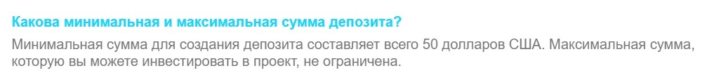 Сомнения в озвученных условиях возникли после информации, которую мы смогли узнать из раздела «Часто задаваемые вопросы». Там сказано, что минимальный депозит равен всего 50 долларам. Но ни в одном тарифном плане столь низких цифр нет. Получается, что все эти условия попросту выдуманы.