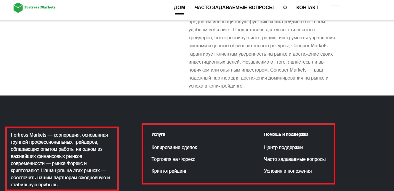 При изучении официального сайта брокера под названием FortressMarkets Live первым в глаза бросается крайне бедный функционал и некоторые неработающие вкладки. При переходе во все разделы, ссылки на которые расположены внизу главной страницы, постоянно открывается один и тот же раздел «О нас». Подобные системные ошибки свидетельствуют о том, что сайт был выполнен в спешке и не рассчитан на долгую работу. Чаще всего подобные платформы создают мошенники.