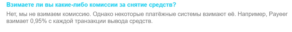 По словам брокера, площадка не взимает комиссию за вывод средств. Есть лишь взносы за использование той или иной платежной системы.
