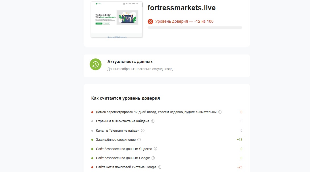 Проведенный анализ деятельности брокера FortressMarkets показал, что доверять этой площадке крайне опасно. Риск понести крупные убытки и потерять весь депозит подтверждается целым набором признаков мошенничества: