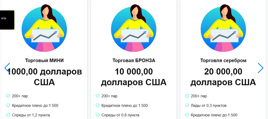 Что касается условия торговли на площадке, то в первую очередь трейдер сообщает о доступных тарифных планах. Пользователю необходимо выбрать один из пяти торговых счетов, которые отличаются суммой начального депозита, размерами спредов и кредитного плеча.