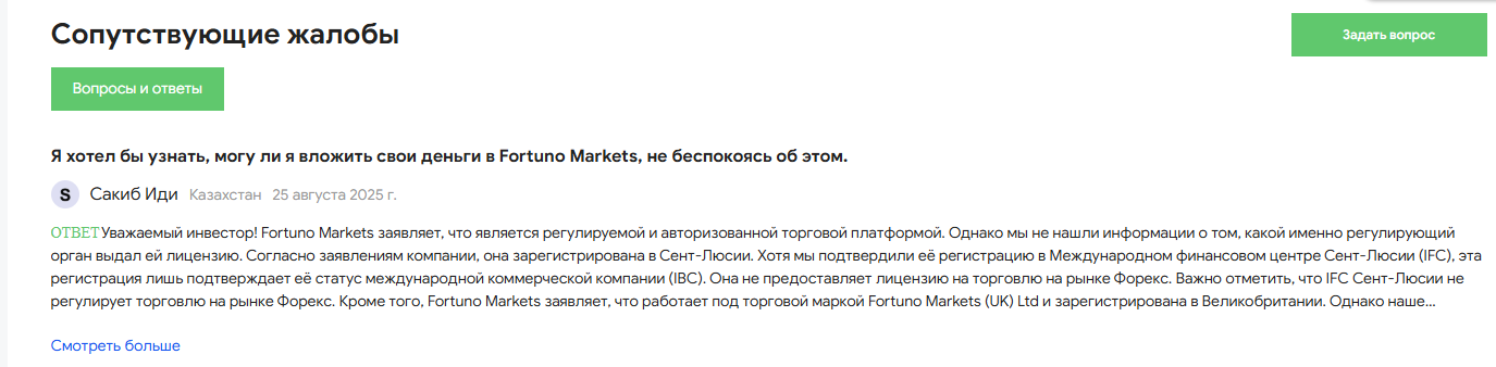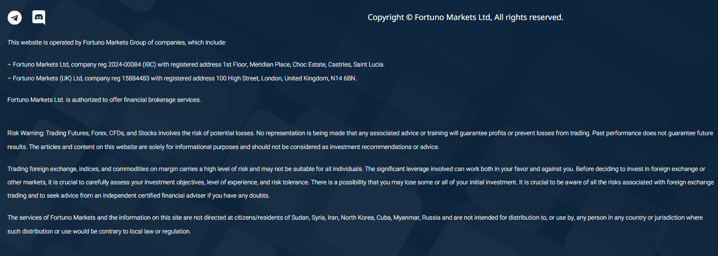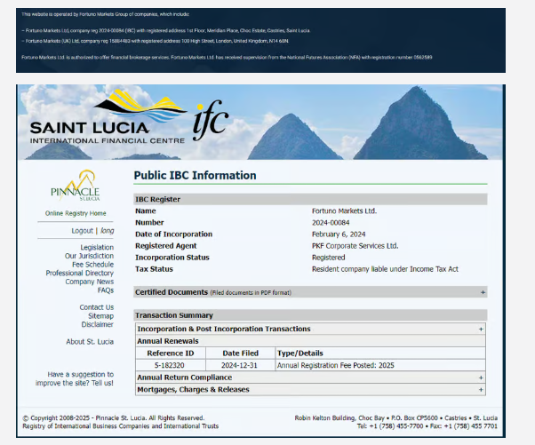 Заявлено, что Fortuno Markets Ltd зарегистрирован на острове Сент-Люсия и в Великобритании.
