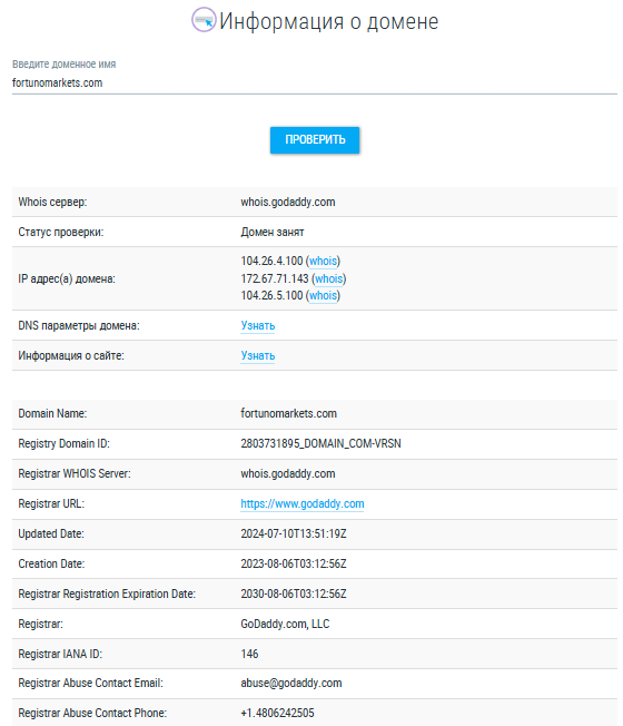 Домен fortunomarkets com зарегистрировали в августе 2023 года. Информация о владельце адреса скрыта настройками приватности.