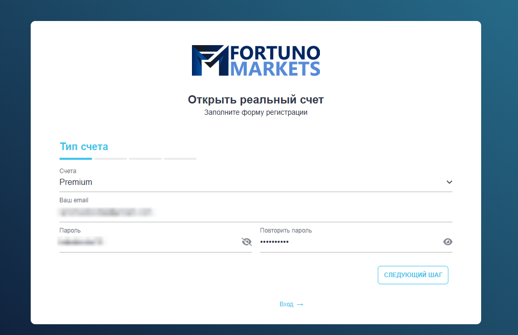 Регистрация на сайте Fortuno Market