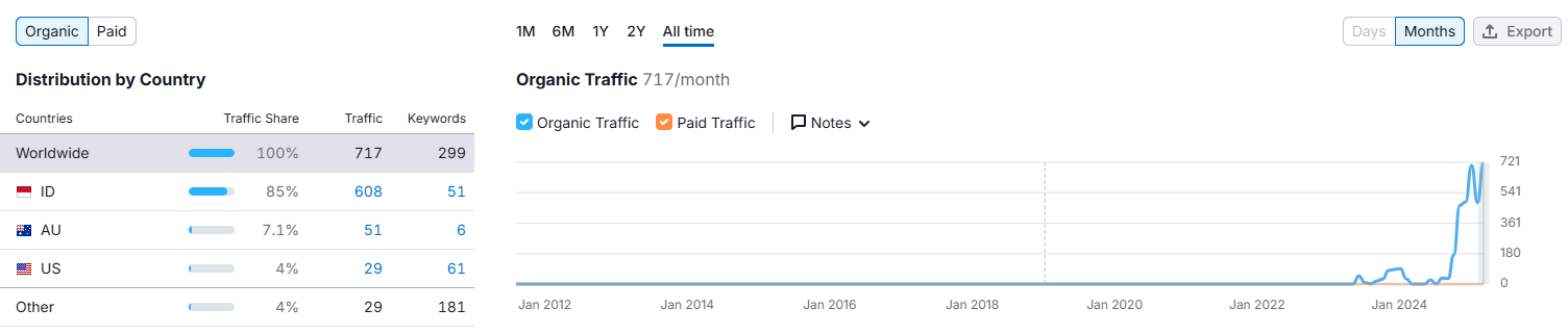 Исходя из аналитики сайта, ежемесячно платформу посещает около 717 пользователей. Такие показатели формируют негативное впечатление, так как трафик недостаточный для международного брокера.