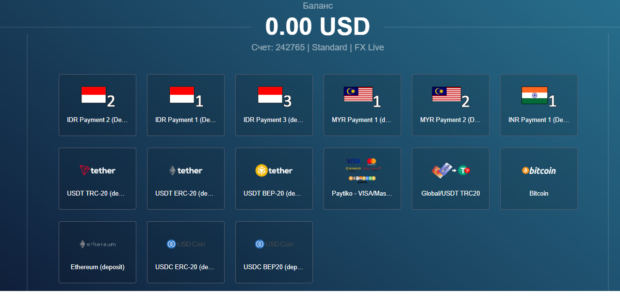 Пополнить счет Fortuno Markets можно с карты или в криптовалюте. Допускается внесение средств на сумму от $10.