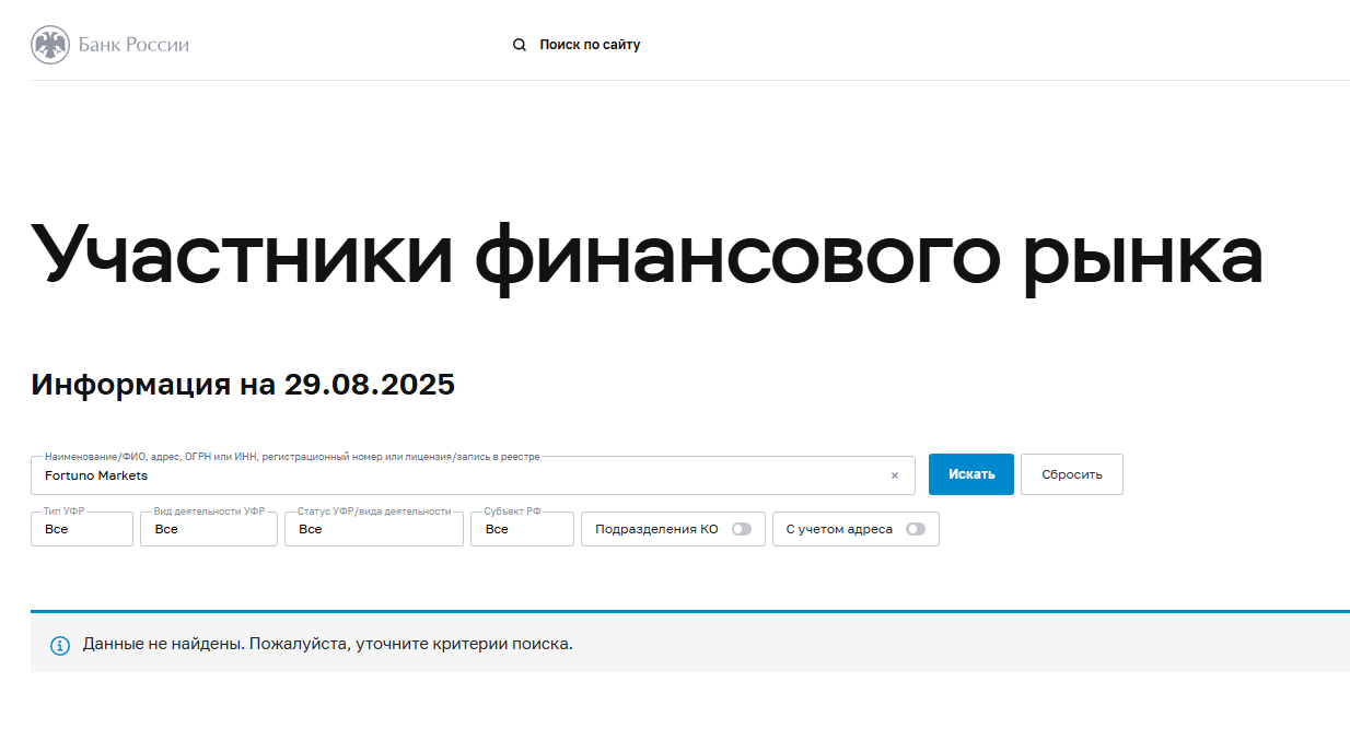 - У Fortuno Markets нет лицензии, разрешающий работать брокером, поэтому компания предоставляет услуги вне закона.