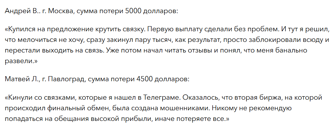 Пострадавшие утверждают, что потеряли несколько тысяч долларов, причем нет ни одного положительного отзыва, который хоть как-то повысил бы оценку бирже. В связи с этим можно считать, что репутация у площадки крайне негативная.