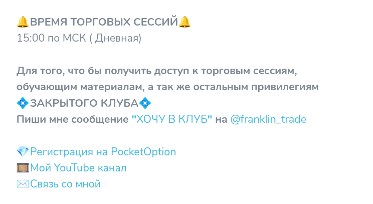 Чтобы туда попасть, платить за вход якобы не нужно. Условие одно: регистрация по реферальной ссылке у брокера бинарных опционов (чаще всего мелькает Pocket Option) и внесение депозита. Автор канала «Франклин Трейд» называет это бесплатным билетом в мир профита, где он делится своими сигналами и стратегиями.По факту же админ просто работает по партнерской программе. Трейдер получает процент от оборота или, что гораздо вероятнее в данной нише, от убытков приведенных клиентов. Также в ленте периодически проскакивает реклама других сомнительных каналов, что тоже не добавляет очков к репутации Franklins Group.