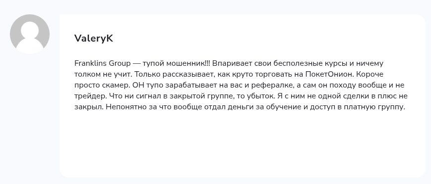 В самом канале писать отзывы некому из-за закрытых комментариев, а вот на сторонних ресурсах и форумах репутация Franklins Group оставляет желать лучшего. Реальные пользователи, поверив обещаниям Franklin Trade, массово жалуются на качество предоставляемых услуг. Трейдеры пишут следующее: