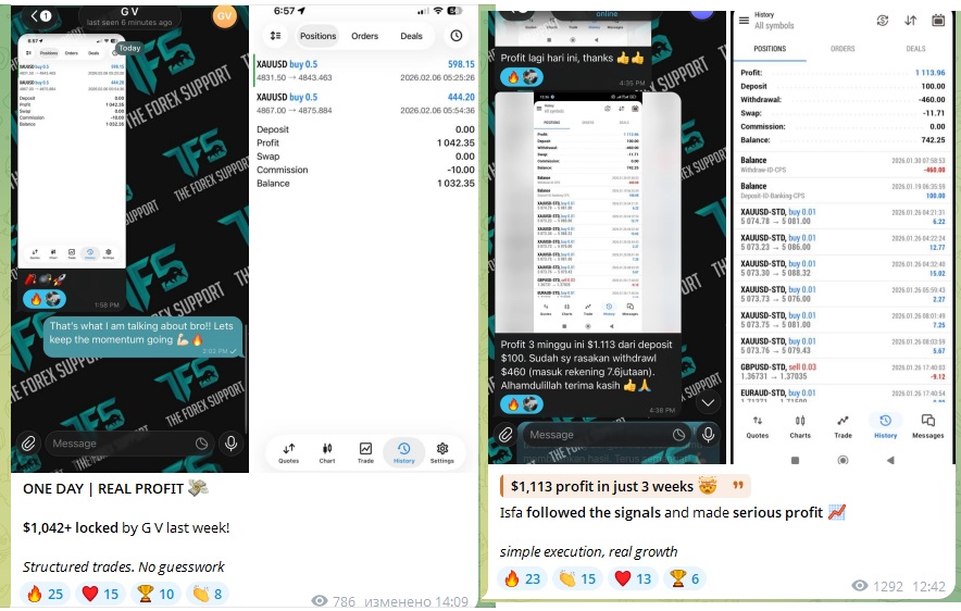 Одним из первых, 14 октября 2023 года, был создан канал в Телеграмм TheForexSupport | Free Forex Signals (@TheFXsupportSignals), на него подписано 120,8К человек, ежедневно появляется 30-40 публикаций, но их читает всего 4% от общей аудитории. Комментарии заблокированы, обратной связи в ленте нет. В контенте упор сделан не на сами сигналы, а на демонстрацию “результатов учеников”: скриншоты прибыли, истории успеха трейдеров из разных стран, сообщения о “последних свободных местах”.