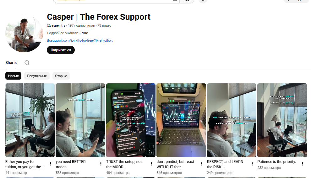 Канал на Ютубе Casper | The Forex Support (@casper_tfs), дата регистрации 13 июня 2025 года, у него всего 197 подписчиков, размещено 73 видео (только в формате шорты), их просмотрели 10 тыс. раз.