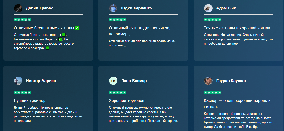 На независимых платформах отзывы о Free Forex Signals отсутствуют. Они есть только на личных ресурсах. На сайте, в формате шаблонных откликов, которые все начинаются со слов “отличный”, “лучший” и “хороший”.