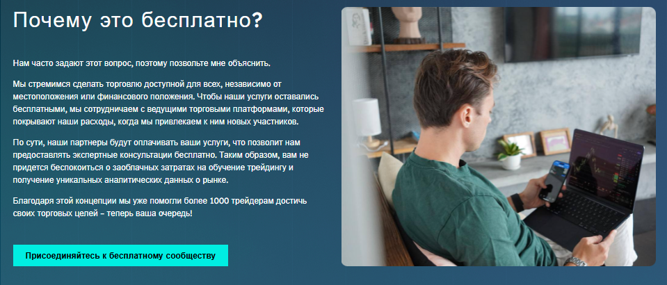 Отдельного внимания заслуживает VIP-направление проекта. Это сообщество подается как полностью бесплатное, но доступ к нему предоставляется только при выполнении одного условия — регистрации по реферальной ссылке и торговле через партнерского брокера, которого администратор продвигает в личной переписке. В рамках випки участникам обещают обучение (включая пятичасовой курс и aBook), ежедневно выдавать по 4-8 сигналов для копитрейдинга, аналитику рынка и персональное сопровождение.