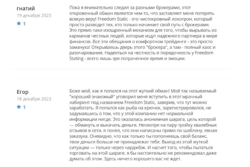 В интернете можно найти большое количество исключительно негативных отзывов о Freedom static, где трейдеры пишут, что брокер “Фридом статик ком” заманил их своими бонусами, а после депозита вывести заработанные средства не дает.