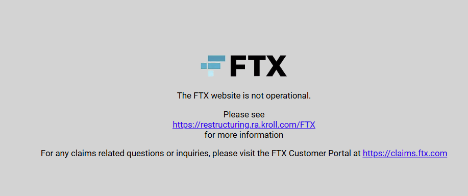 Биржа базируется на сайте Ftx com. На сегодняшний день, август 2024 года, он не загружается. Информация о причине нефункциональности интернет-ресурса представлена на скриншоте ниже.