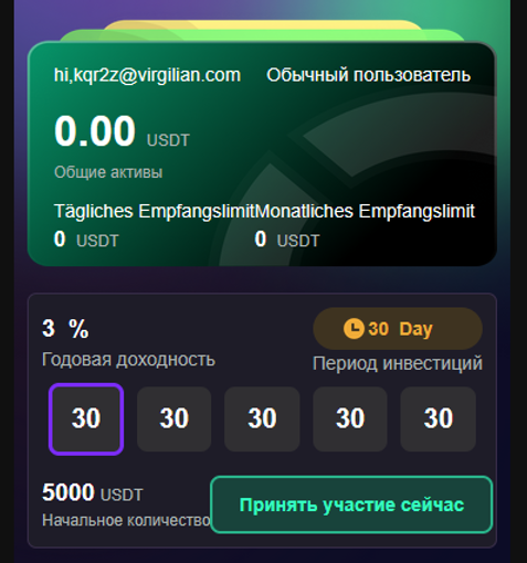 В разделе с кошельком указывается статус клиента и общий баланс в USDT. Сразу можно пополнить счет, выбрать срок и программу инвестирования. Все тарифы рассчитаны только на 30 дней с возможностью реинвестирования. Стартовый порог очень высокий – от 5000 USDT под 3% годовых. Для проекта Fucsycom с не самыми лучшими отзывами такое значение вклада выглядит странно. Максимальная сумма депозита – 50000 с доходностью до 7%.