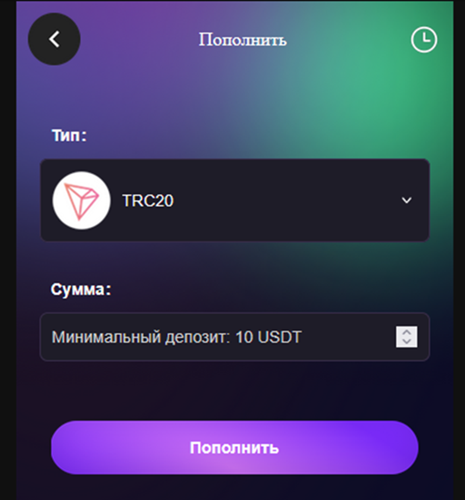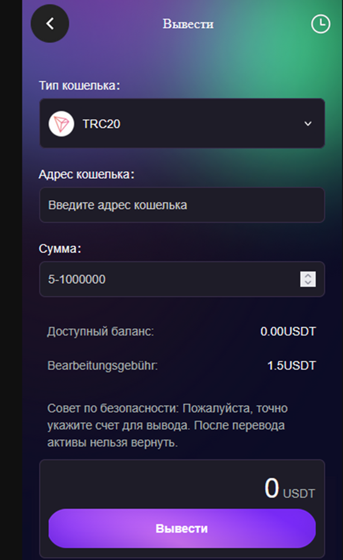 Для пополнения счета можно использовать только USDT. Минимальная сумма равна 10 у.е. в эквиваленте, но точные сроки и комиссионные не указываются.Для вывода можно выбирать только криптовалюту (сеть TRC20). Минимальная сумма 5 USDT, комиссия – 1,5%. Сроки обработки транзакций неизвестны. Также отсутствует информация о дополнительных платежах за страхование, обслуживание счета.
