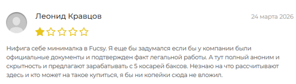 В сети практически нет отзывов о брокере Fucsy. Компания не имеет аккаунтов в социальных сетях и мессенджерах, отдельных веток на профильных сайтах. Но на внешних ресурсах удалось найти несколько замечаний, которые позволяют сделать выводы, что Fucsy com – обычный скам проект.