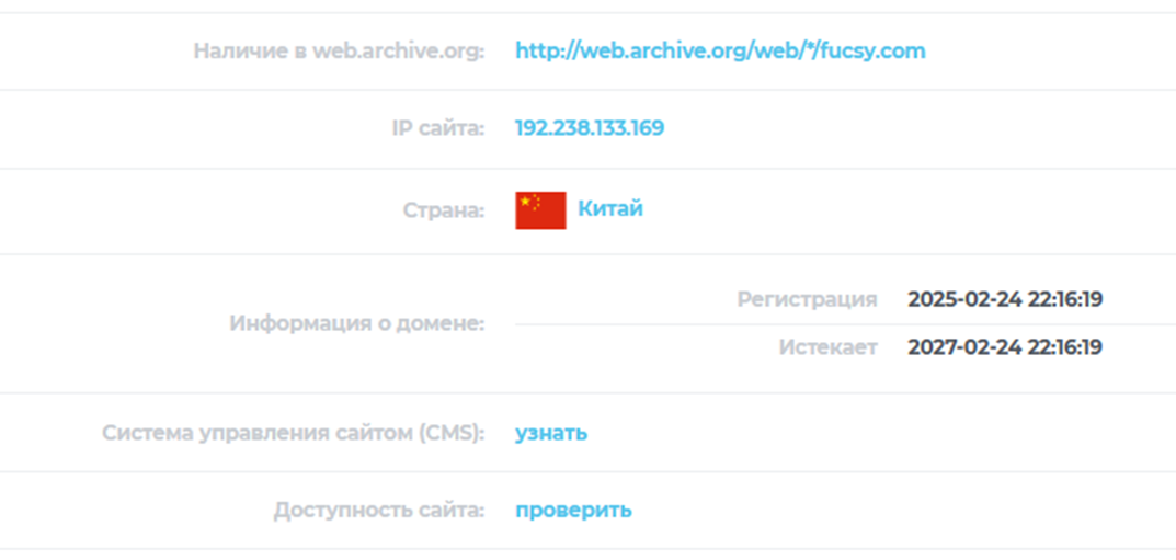 Дата начала работы сервиса не указана. Но проверка сайта показывает, что он был зарегистрирован через китайский IP 24 февраля 2025 года и действителен 24 месяца. Владельцы скрыты, подробная информация отсутствует.