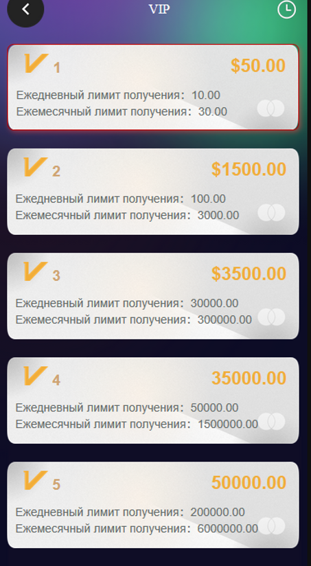 Потенциальным клиентам также предлагают VIP программы инвестирования. Это пять уровней с платным переходом. Покупка ВИП1 обойдется в 50 у.е., ВИП2 – 1500 у.е.. Для перехода на максимальный уровень ВИП5 придется выложить 50000. Сроки действия каждого тарифа – 2 месяца. Для первого уровня действует автоматическая отмена через 60 дней. Остальные можно продлить при необходимости или отправить запрос на возврат суммы вклада.