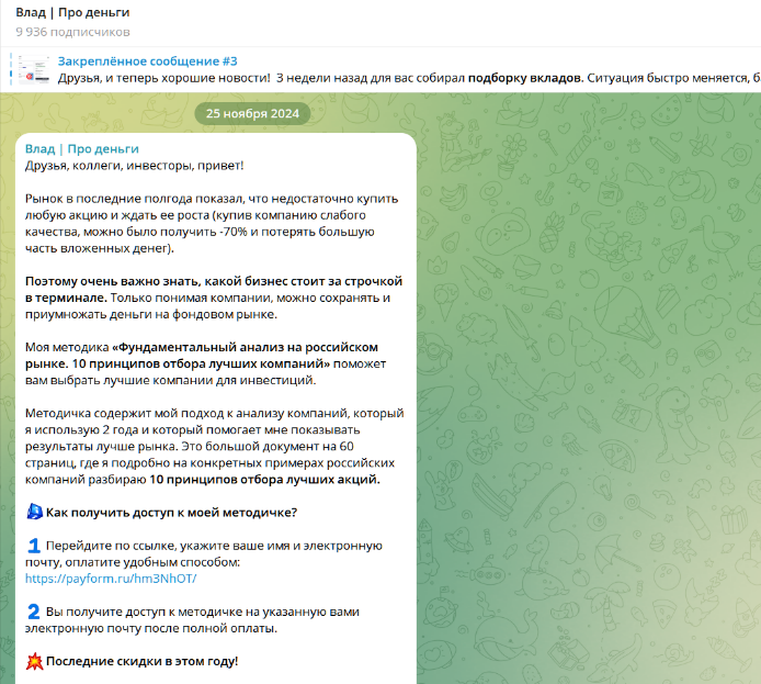 Стоимость обучающих материалов невысокая — всего 3690 рублей. Оплатить можно с любой карты банка РФ на сайте vladprodengi payform ru.Непонятно, почему у этого наставника такие разницы в ценах. За один и тот же обучающий материал просят разную стоимость. Можно купить методичку и за 690 рублей, и за 3690 рублей.