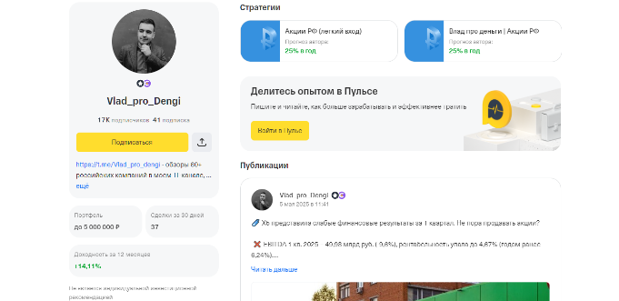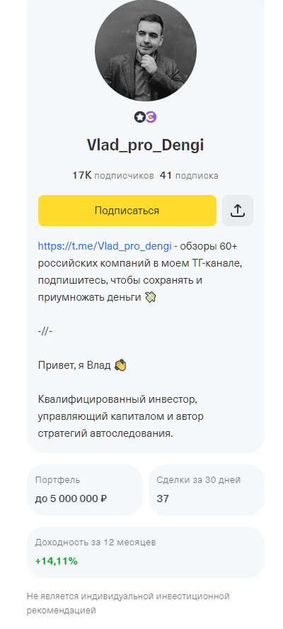 Профессиональный игрок на российском фондовом рынке Владислав Еремин, инвестор со стажем. В своем ТГ канале и профиле «Т банка» Vlad pro dengi наставник делится секретами прибыльных инвестиций.