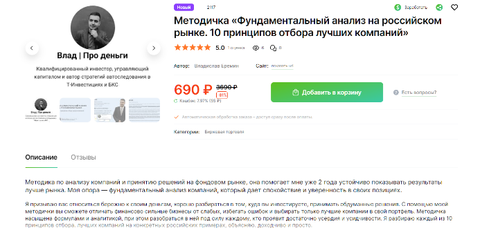 Сейчас ее можно купить с существенным дисконтом, всего за 690 рублей. Прежняя стоимость методички инвестора была 3699 рублей. Явно книга не пользовалась популярностью, и сейчас активный и «успешный» инвестор снизил цену на свое произведение.