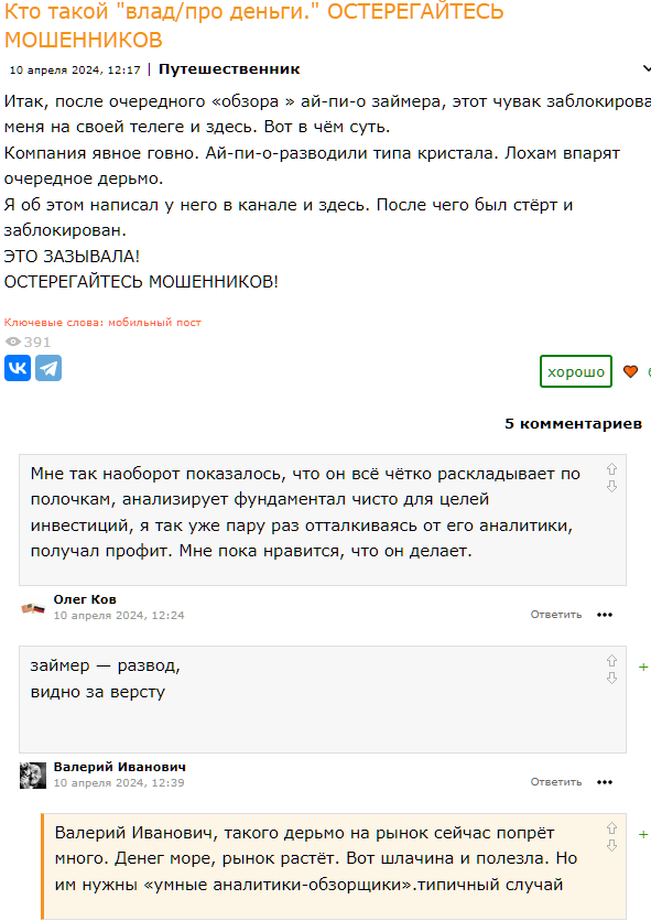 Комментарии про этого инвестора негативные. Пользователи сообщают, что он продает заведомо убыточные активы по завышенным ценам. Если ему об этом пишут на канале, то сразу блокирует недовольных и добавляет в черный список.