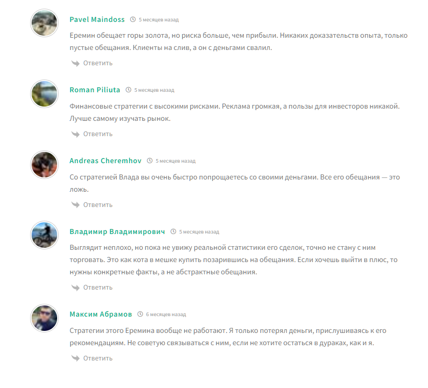Инвестор не показывает свой верифицированный портфель акций. Сложно однозначно утверждать, насколько успешна его стратегия инвестиций. Но то, что есть высокий риск капиталовложений по системе Влада Еремина – это точно.